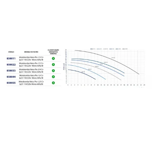 A motobomba Veico Pro 1,25 CV oferece excelente desempenho, com vazão de até 18 m³/h e pressão de até 18 MCA. Consulte a tabela de desempenho para escolher a motobomba ideal para sua piscina: